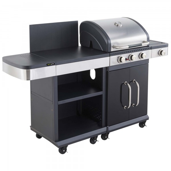 Der Gasgrill besteht aus einem "Grill"- und einem "Plancha"-Teil, sodass Sie Ihr Fleisch, Gemüse oder Fisch gleichzeitig zubereiten können. Aber das ist noch nicht alles: Er verfügt auch über einen Seitenkocher, um Ihre Gerichte auf Temperatur zu halten, und über 3 Brenner, die mit einer integrierten Piezo-Zündung ausgestattet sind und eine Leistung von 11,5 kW haben. Außerdem verfügt er über eine Haube mit integriertem Thermometer, 4 multidirektionale Räder und einen doppeltürigen Kasten, in dem Sie Ihre Gasflasche oder Ihr Zubehör aufbewahren können. Die große Arbeitsfläche, der Stauraum und die bremsbaren Räder mit Richtungsanzeige sorgen dafür, dass der Tisch keine Wünsche offen lässt. Befestigen Sie ihn an Ihrem Grill und genießen Sie eine echte Outdoor-Küche, die bis zu 8 Gäste bewirten kann!