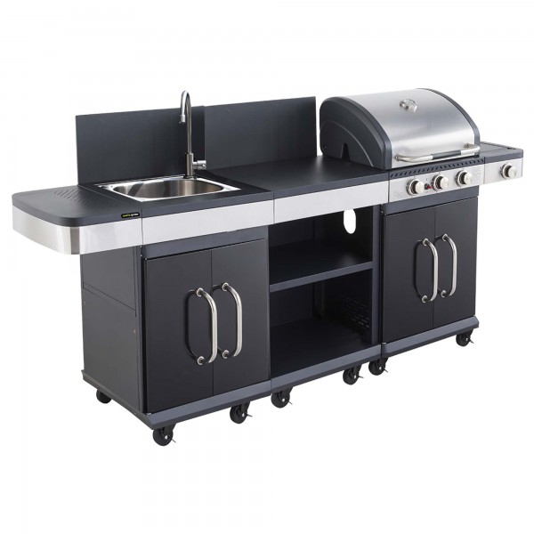 Der Gasgrill besteht aus einem "Grill"- und einem "Plancha"-Teil, sodass Sie Ihr Fleisch, Gemüse oder Fisch gleichzeitig zubereiten können. Aber das ist noch nicht alles: Er verfügt auch über einen Seitenkocher, um Ihre Gerichte auf Temperatur zu halten, und über 3 Brenner, die mit einer integrierten Piezo-Zündung ausgestattet sind und eine Leistung von 11,5 kW haben. Außerdem verfügt er über eine Haube mit integriertem Thermometer, 4 multidirektionale Räder und einen doppeltürigen Kasten, in dem Sie Ihre Gasflasche oder Ihr Zubehör aufbewahren können. Der Servierwagen ist mit seiner großen Arbeitsfläche, den Ablagefächern und den bremsbaren Rädern mit Richtungsanzeige eine echte Bereicherung für jeden Haushalt. Die Spüle ist eine große Hilfe beim Waschen von Lebensmitteln, Geschirr oder Händen, während Sie draußen Ihre Mahlzeiten zubereiten. Nachdem Sie diese beiden Module an Ihrem Grill befestigt haben, können Sie eine echte Outdoor-Küche genießen, die bis zu 8 Personen bewirten kann!