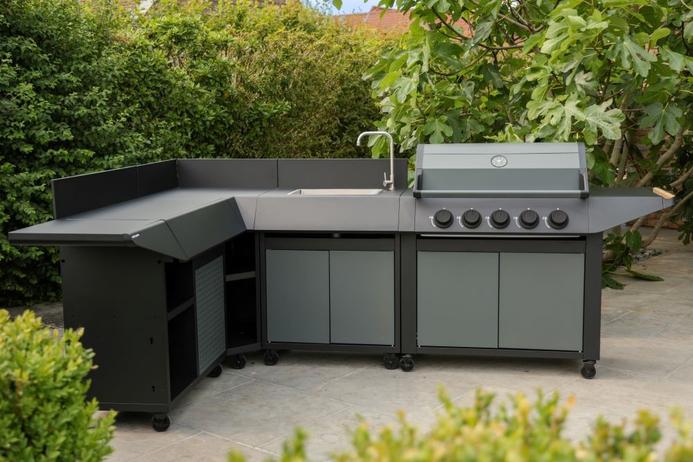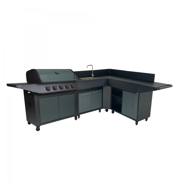 Unsere neue BURN-Küche verfügt über ein Eckmodul, das Ihrer Außenküche eine maßgeschneiderte L-förmige Konfiguration verleiht.