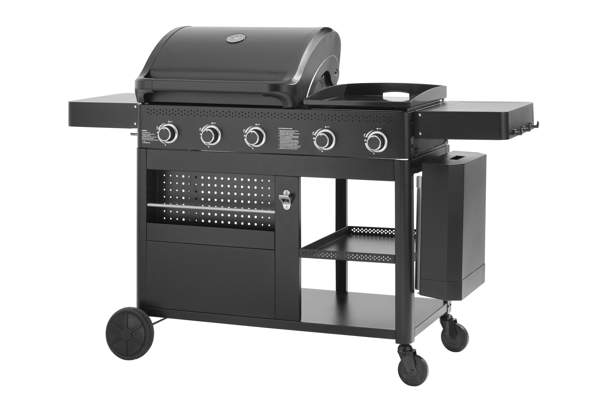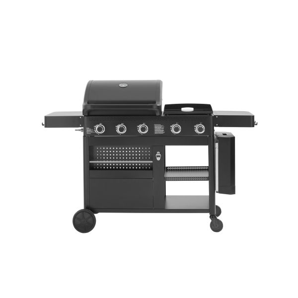 Matériaux : Chariot, cuve et capot en acier epoxy, grilles et plancha en fonte émaillée