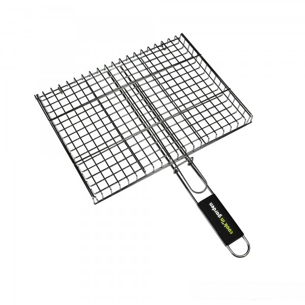Ontdek het plezier van barbecueën op houtskool met deze rechthoekige kooigrill in verchroomd staal, waarvan de neergeklapte zijkanten voorkomen dat je eten eraf valt. Het is vuurbestendig en heeft een "soft-touch" handvat voor een goede grip en een gemakkelijke hantering.