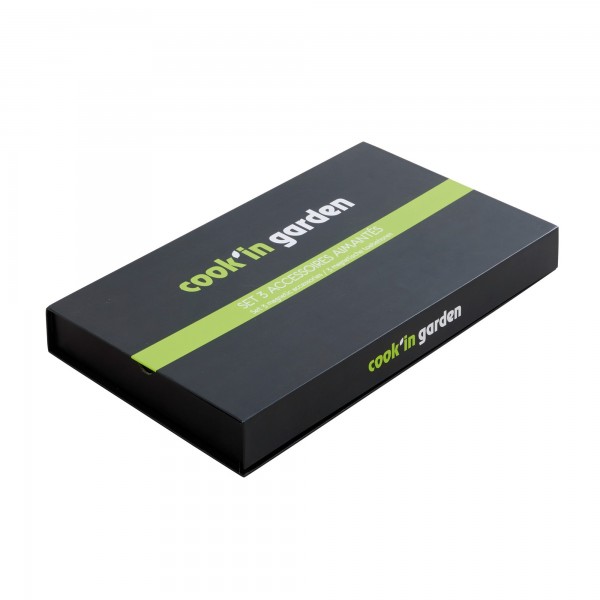 Nooit meer zoeken naar keukengerei tijdens je zomerse lunches. Dankzij de nieuwste innovatie van Cook'in Garden zijn je accessoires nu magnetisch! In deze mooie doos vind je alle benodigdheden om te grillen (de tang, vork en spatel) en hang je ze in één beweging aan de voorkant van je barbecue, als een echte pro!